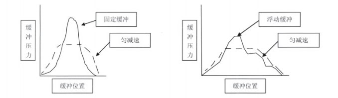 由固定缓冲和浮动缓冲在同样条件下产生的实际压力曲线的对比显示了浮动缓冲的有点,更密切地逼近匀减速曲线,压力尖峰低,比较低的冲击减少了机器噪声和维修。我公司所设计油缸一般全部采用浮动缓冲。