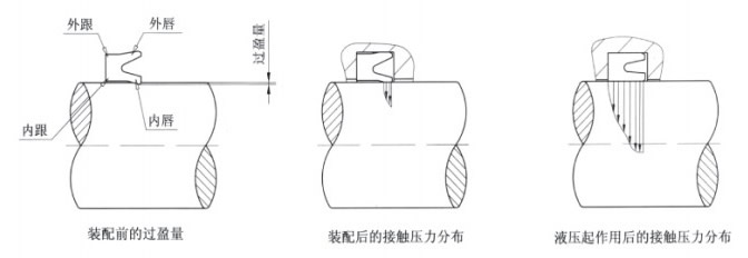 以u形密封件为例说明。顾名思义,U形密封件就是U形槽的密封件。这种密封件有内唇和外唇,在另一端示出了内跟和外跟。图1为装入安装槽时因过盈量而变形的U形密封件,这就使得唇口与活塞杆相接触。当加上液压(油压)时,密封件的根部就发生变形,这样,整个滑动面就和活塞杆便面完全贴在一起了。唇口和根部的接触压力分布的情况与密封特性紧密相关。