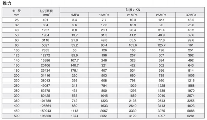 如果活塞杆受压,则使用下面的推力表:找出最接近需要的工作压力:在同一栏里,找出移动该负载所需的力;在同一行里,找出所需的缸径。