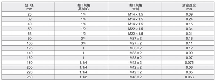 影响液压缸速度的因素之一是引入或排出油口连接管路中的油液流量。连接管路中的油液流速应限制与5m/s,以便把油液紊流、压力损失和液压冲击减至最小。下表数据为油液流速5m/s时的活塞速度。如果超过此范围请加大油口规格和连接管路。