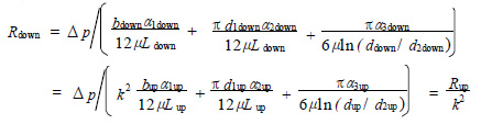 水压缸两端密封为两个并联的流阻,且其结构参数间存在着线性比例关系, 比例因子 k = 0. 733 。由于水压缸单端密封的流阻主要集中在3 道活塞环上,因此,取其中1 道活塞环为研究对象,下标“up”表示水压缸上端活塞环密封,下标“down”表示水压缸下端活塞环密封, 则由式(2) 可知:
