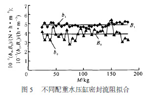 根据水压缸单端密封流阻计算公式(3) 可推知:水压缸两端密封总流阻存在着线性比例关系, Rt .down = Rt.up/k2 = 1. 86 Rt .up 。其中, Rt.up 为水压缸上端密封总流阻, Rt.down为水压缸下端密封总流阻。于是水压缸总的密封流阻为: