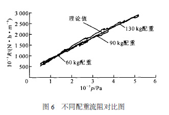 图6 为60 、90 和130 kg 配重实验结果与理论公式计算所得流阻的对比曲线。该曲线显示,实验结果与公式计算结果吻合得很好。同时,可以看出,随着配重的增加,步升开始所需压力逐渐增大,步升前充压时间逐渐变长,流阻对应的压力范围随之逐渐增大。3 结束语